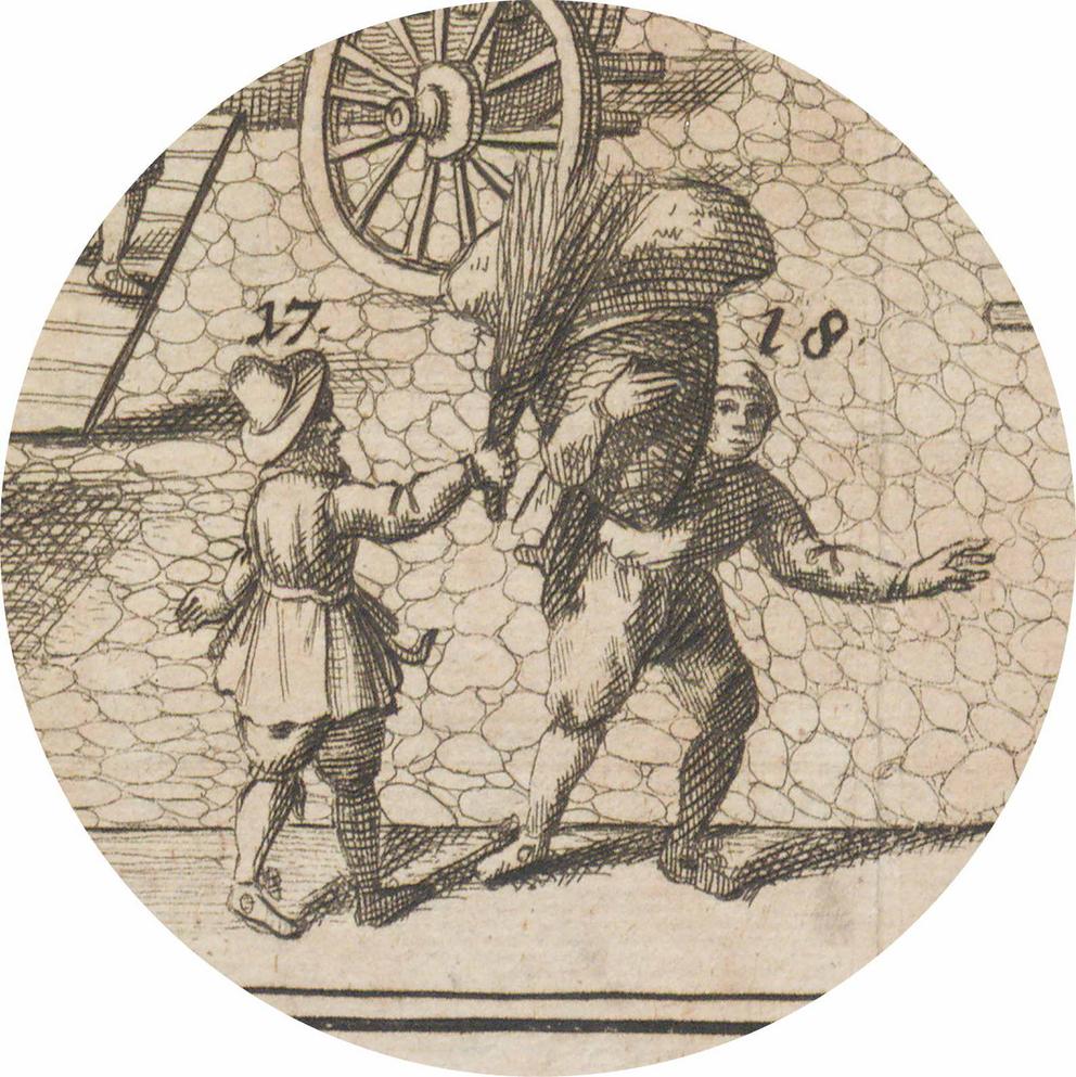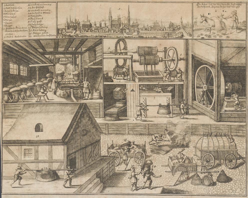 The comic-like image shows the salt extraction process in Halle around 1670 and the people involved at a glance using numbered stations – from lifting the brine to loading the salt. Copperplate engraving in: Friedrich Hondorff: Das Saltz=Werk zu Halle in Sachsen befindlich […], Halle 1670. Halle, Franckesche Stiftungen: BFSt: S/A:1398