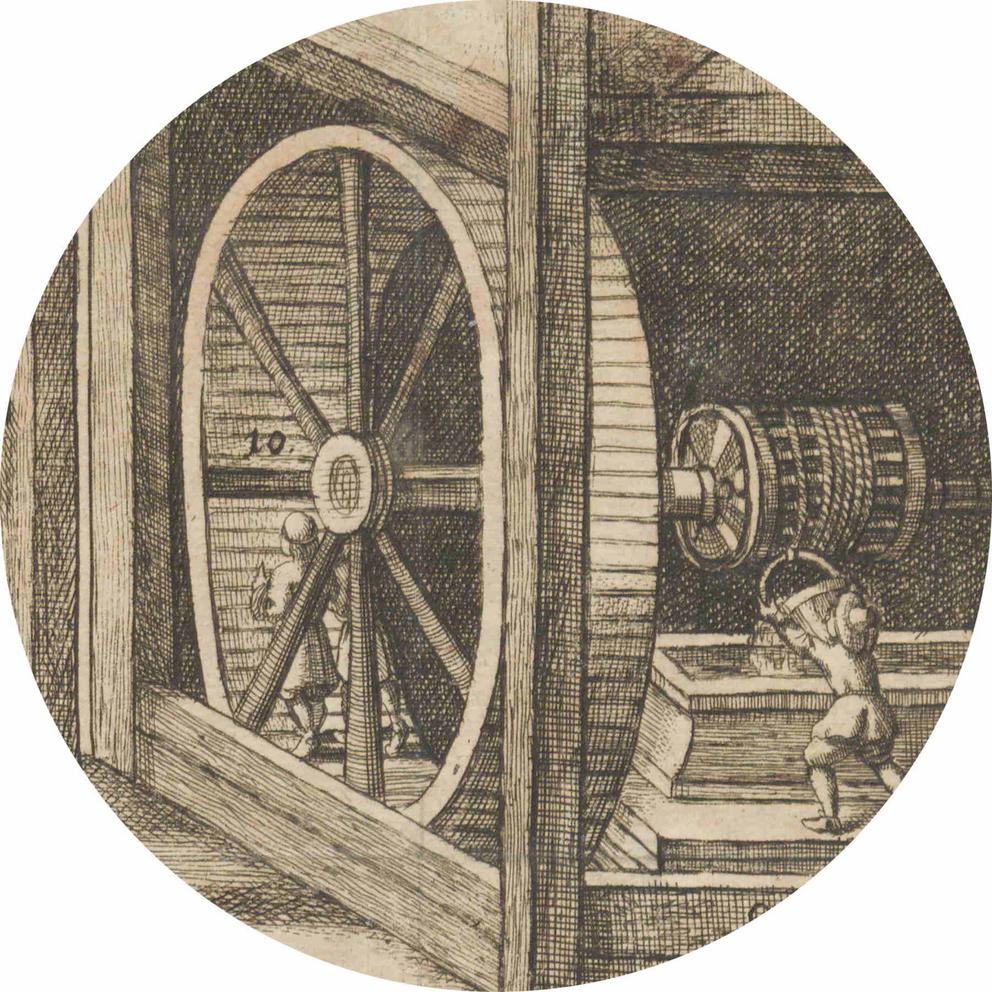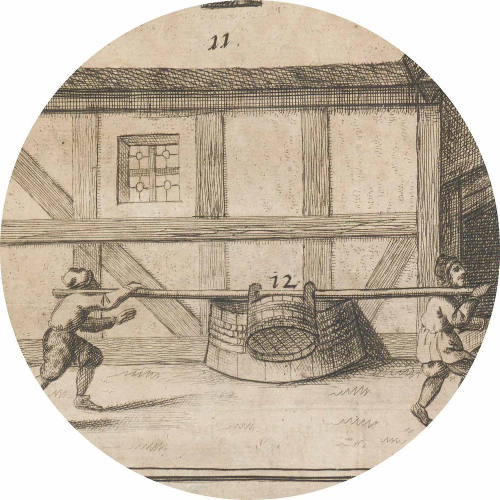 The well workers (»Bornknechte«) – divided into »Haspeler«, »Radtreter«, »Störtzer«, »Zäpffer« and »Träger« – were at the beginning of salt production. Haspeler and Radtreter laboriously pulled the brine out of the wells by means of muscle-powered hoists, which was immediately collected by the Störtzer and Zäpffer in large troughs and filled into tubs for transport to the boiling huts.