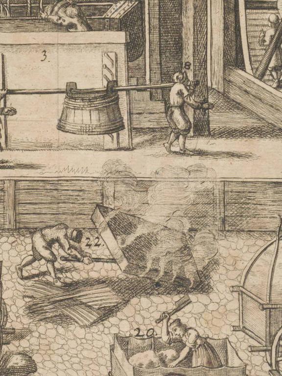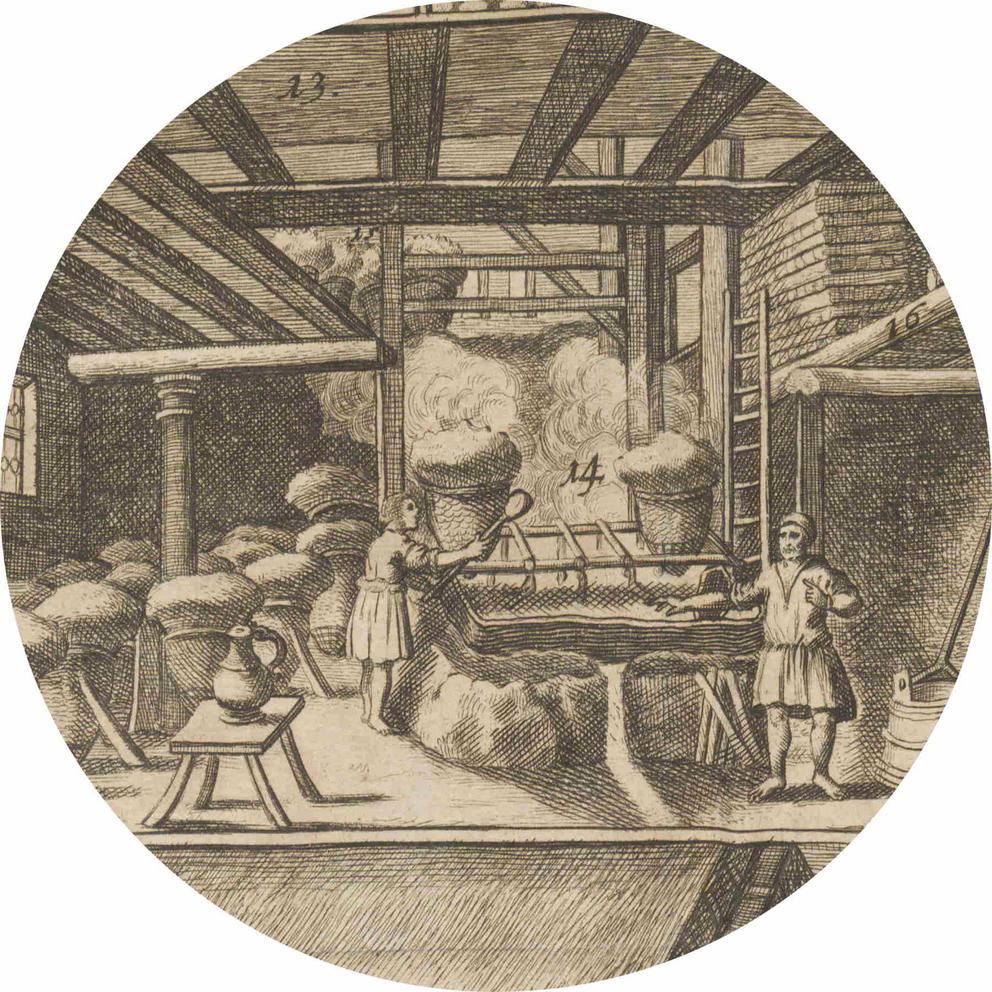 Salt boilers at work at the boiling hearth, etching (detail) by Christian Erhart (drawing) and Emanuel Eichel (etching) in: Paul von Stetten: Der Mensch in seinen verschiedenen Lagen und Ständen für die Jugend geschildert. 2: Tafelband. Augsburg: Haid u. Sohn, 1779, Tab. XIX. Augsburg, Stadt- und Staatsbibliothek: S 1584 -2, urn:nbn:de:bvb:12-bsb11279054-8