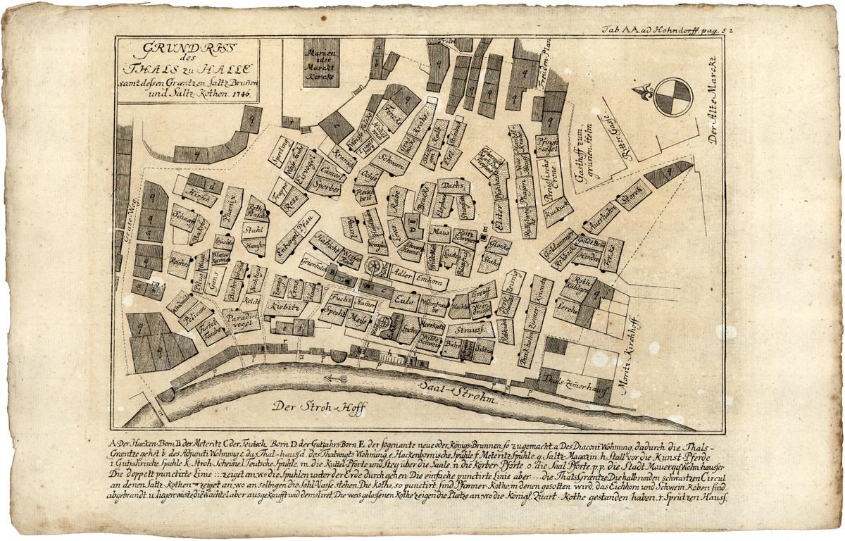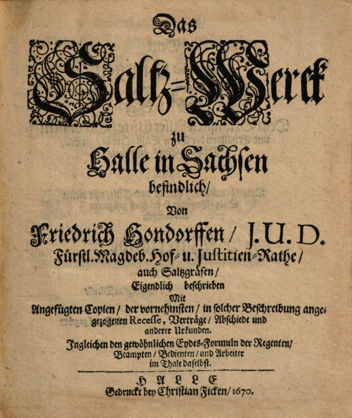 In 1749/50, the Halle jurist and Salt Count Johann Christoph von Dreyhaupt (1699-1768) published a two-volume Beschreibung des Saal-Creyses: a lavishly illustrated treatise on the history and culture of the city of Halle and the surrounding area. To this he added Hondorff's outdated writing on the Thalsaline as an appendix and supplemented what had changed since 1670. Today both editions of Hondorff's work are important sources for the history and technology of salt production in pre-industrial Halle.